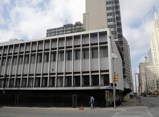 The lack of parking — which was always a concern even when the building was in use — is a challenge for the building’s rehabilitation, but excess capacity in nearby garages could be a solution. The private Gold Ring Garage once stood across Commerce before replaced by the park. Previous owners considered the library building only useful today as a parking garage for the adjacent Statler hotel. This lack of creativity would deprive the busy corner from much-needed destination retail forming part of a vibrant mixed-use development.